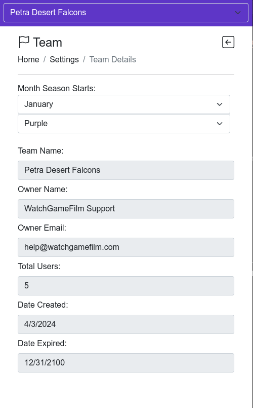 The Team Profile Settings page allows team administrators to view important details about their team, including team name, owner information, user count, and key dates. This page also provides the ability to modify the Season Start Month and Team Color settings.