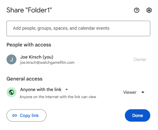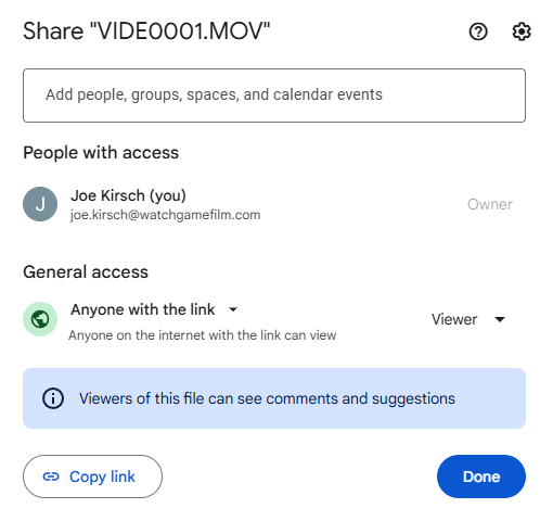 - Copy the resulting link and submit it to WatchGameFilm in the Film Transfer dialog